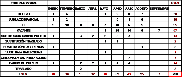 Se han autorizado 16 jubilaciones parciales, y se han cubierto las bajas por enfermedad (IT) de 55 compañeros/as. Además, se han efectuado 14 contratos de superior o distinto puesto de trabajo que han permitido el mismo número de contratos temporales de sustitución. Es más, se han sustituido incluso los dos traslados temporales que se han concedido.