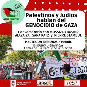 El Sindicato de Periodistas de Andalucía (SPA/FeSP) y el Ayuntamiento de Dúrcal organizan un conversatorio sobre el genocidio en Gaza, con la participación de Mussa’ab Bashir Alazaiza, Sarah Katz y Pierre Stambul.